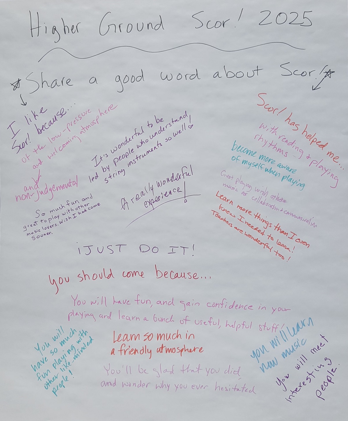 Learning at Your Level: Scor! events are designed with your level in mind, so you'll have a terrific learning experience. You'll feel right at home surrounded by others at your level who share your musical interests, with music & instruction tailored just for you, giving you the best possible musical, learning, & community experience.