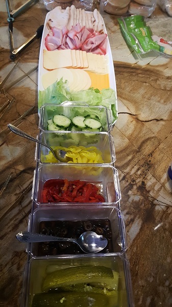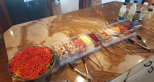 Salad bar with toppings galore (chicken, ham, bacon bits, hard boiled egg, beans, veges, & more!)