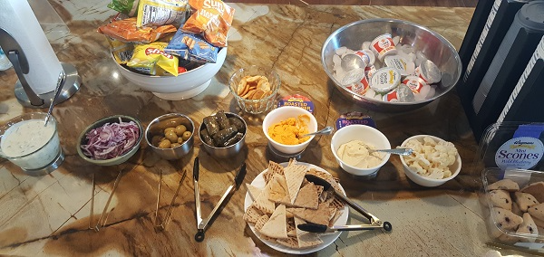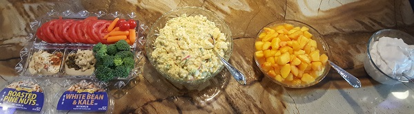 Various sides such as humus, potato salad, fruit, yoghurt, etc