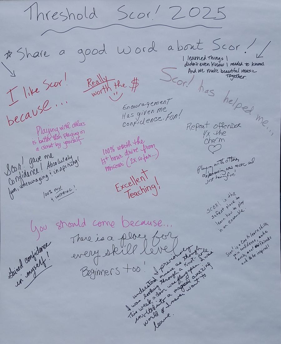 Learning at Your Level: Scor! events are designed with your level in mind, so you'll have a terrific learning experience. You'll feel right at home surrounded by others at your level who share your musical interests, with music & instruction tailored just for you, giving you the best possible musical, learning, & community experience.