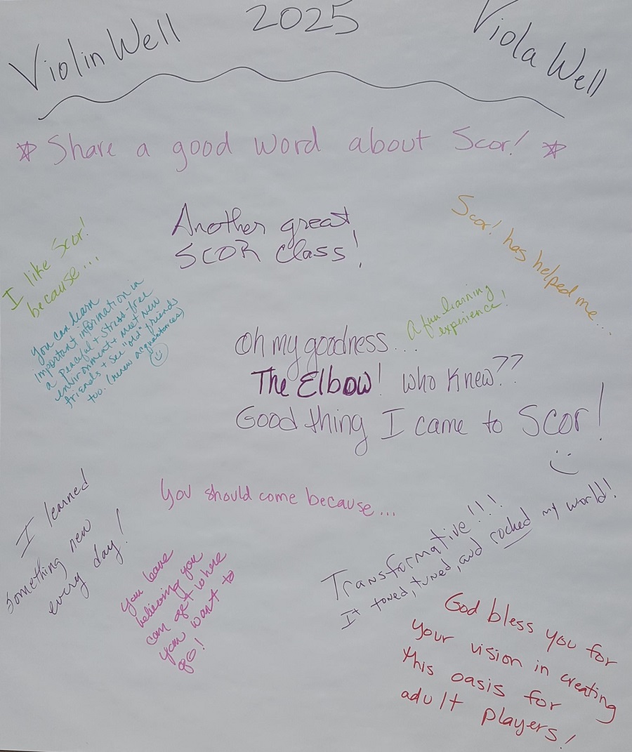 The atmosphere at Scor! is unique & special. It's a learning, growing, fun, exciting, supportive, encouraging, educational, low-pressure, challenging, inspirational, & transformational experience. And, it's tailored especially for adult string players like you & at your level by national leaders in the field of adult string education. Plus, you'll have a great time in the relaxed, fun atmosphere. So, you'll make music with newfound friends in ensemble, participate in unique & amazingly informative instructional sessions, and work with incredible, knowledgeable faculty. It's a special immersion experience created just for you!